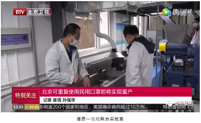 此次道恩集团向北京化工大学捐赠的20万只可重复使用民用卫生口罩,其原料就是双方在道恩—北化联合实验室共同研制开发的。同时,按照道恩股份与北京化工大学共同参与起草的《可重复使用民用口罩团体标准》,这些口罩是由道恩自己的口罩生产线生产制造的。“能够让北京化工大学的老师、同学们戴上我们自己研发生产的口罩,能够为北京化工大学复学助力,我深感荣幸和自豪!”于晓宁董事长说。