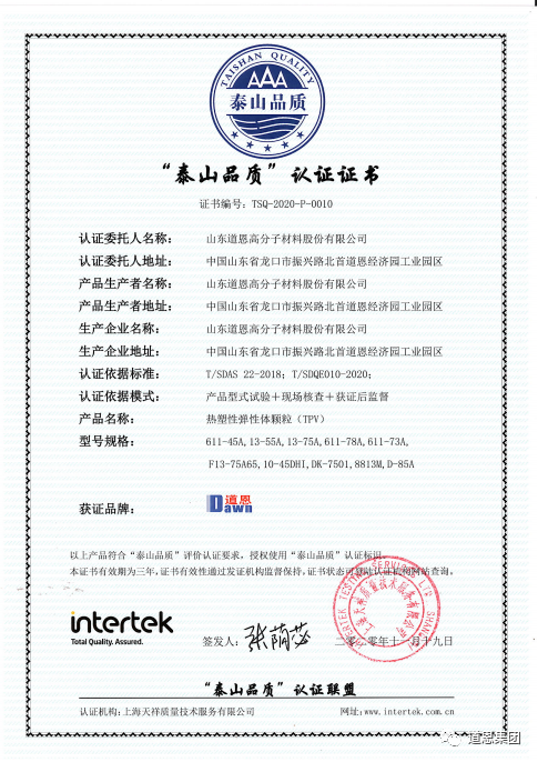 日前,道恩股份“热塑性弹性体(TPV)”产品通过“泰山品质”认证, 成为“代表山东制造”的高端品牌。同时,在刚刚结束的2020年度山东知名品牌认定工作中,道恩股份聚丙烯(PP)熔喷专用料、道恩钛业公司二氧化钛颜料(金红石型钛白粉)被认定为山东知名品牌(产品)。由此看出,道恩产品的品质越来越高端,道恩品牌影响力越来越大。泰山品质、山东知名品牌,道恩刚刚收获一批“荣誉”