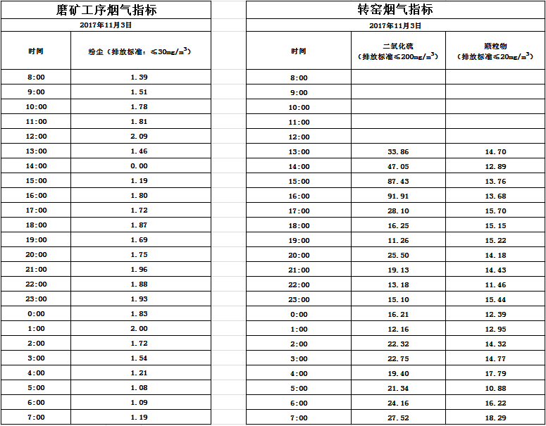 山东道恩钛业股份有限公司2017年11月03日磨矿工序烟气及转窑烟气指标数据: