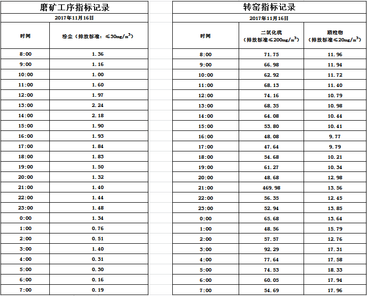山东道恩钛业股份有限公司2017年11月16日磨矿工序烟气及转窑烟气指标数据: