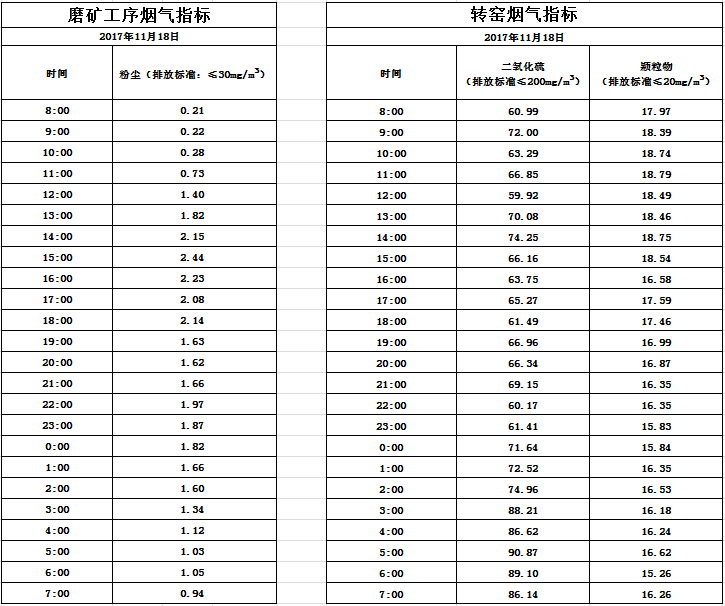 山东道恩钛业股份有限公司2017年11月18日磨矿工序烟气及转窑烟气指标数据: