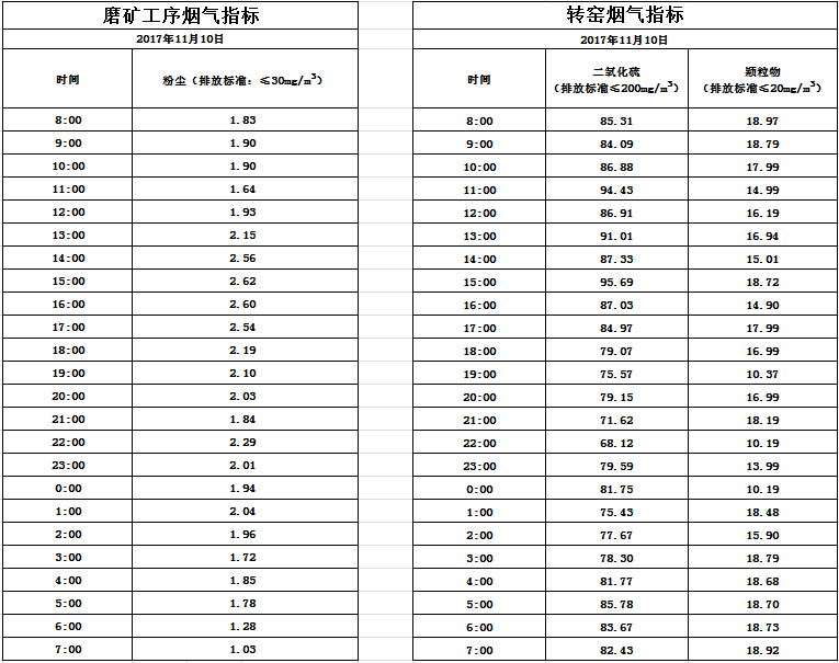 山东道恩钛业股份有限公司2017年11月10日磨矿工序烟气及转窑烟气指标数据: