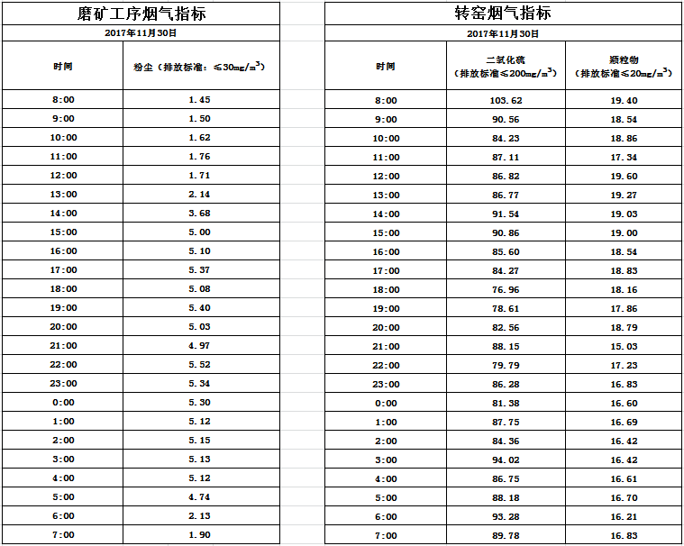 山东道恩钛业股份有限公司2017年11月30日磨矿工序烟气及转窑烟气指标数据: