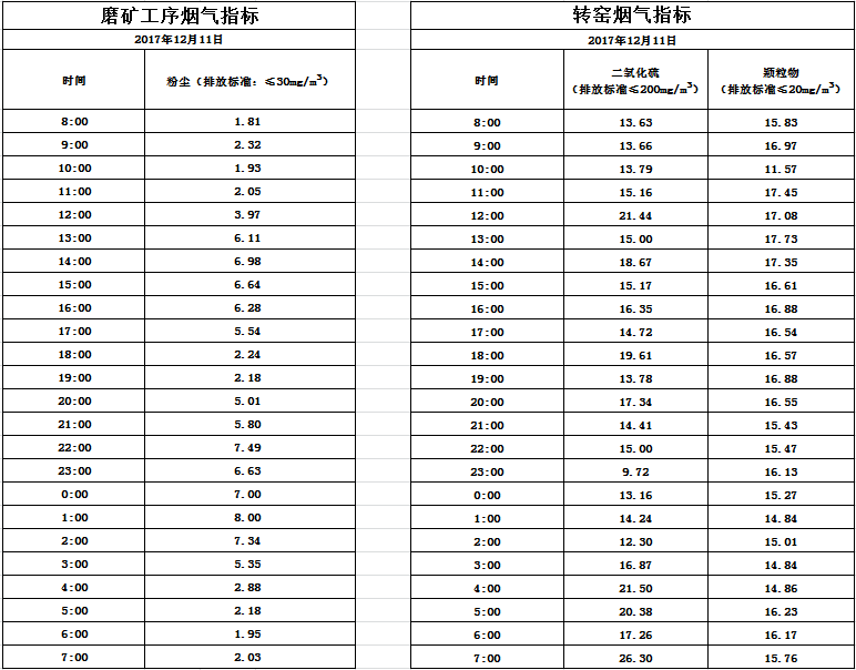 山东道恩钛业股份有限公司2017年12月11日磨矿工序烟气及转窑烟气指标数据: