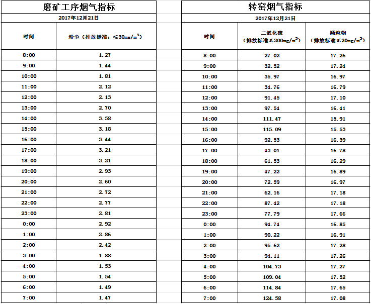 山东道恩钛业股份有限公司2017年12月21日磨矿工序烟气及转窑烟气指标数据: