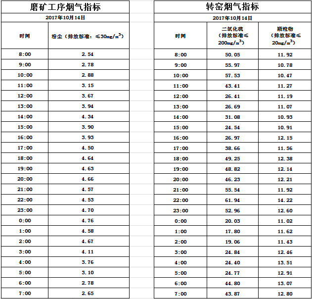 山东道恩钛业股份有限公司2017年10月14日磨矿工序烟气及转窑烟气指标数据:
